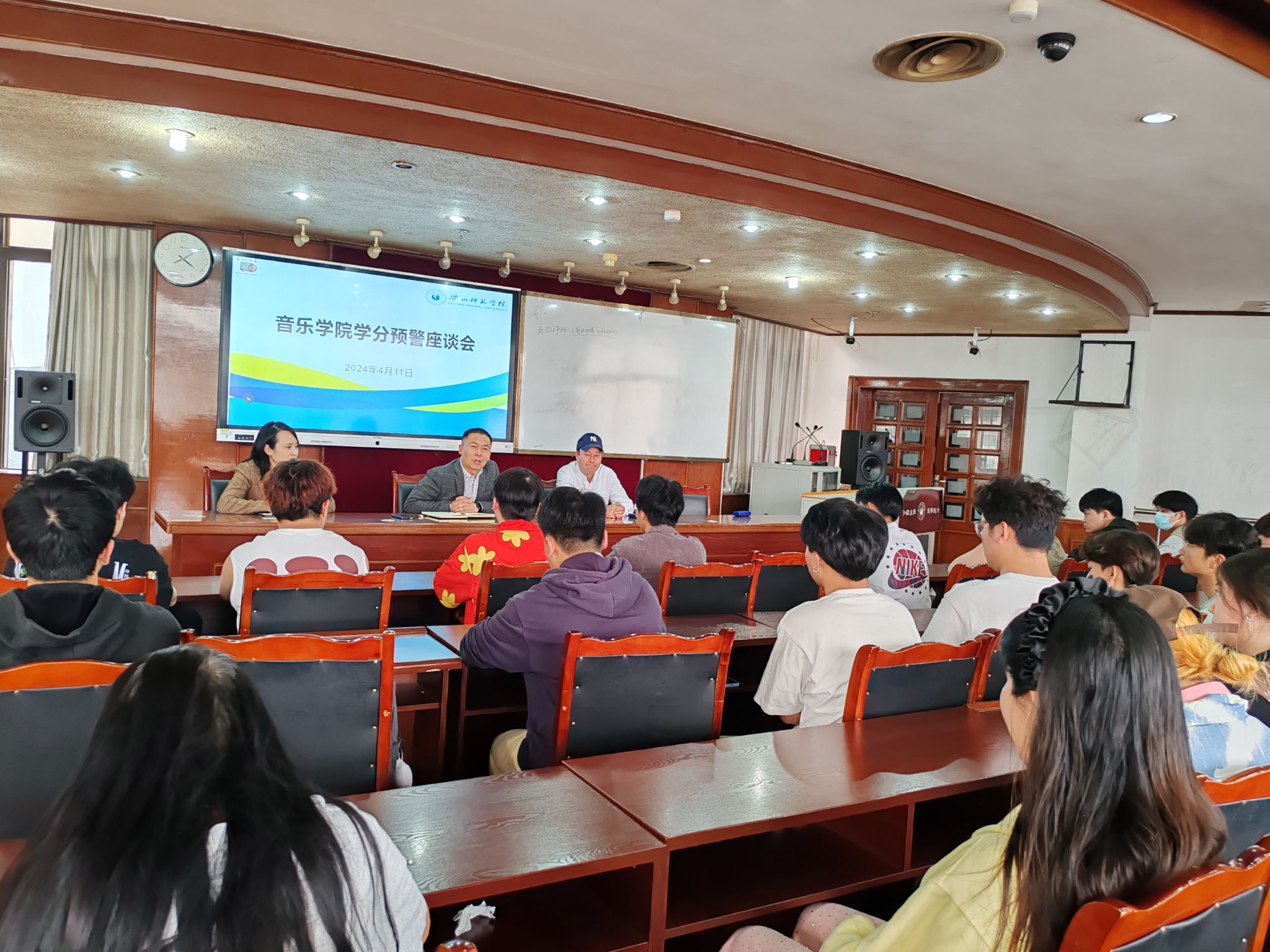 本网讯(文图/张玉莲)4月11日,音乐学院在会议室召开学分预警学生座谈会。音乐学院党委书记宋军,院长周特古斯,党委副书记、纪委书记余友情,全体辅导员以及各年级学分预警学生参加了此次座谈会,会议由余友情主持。