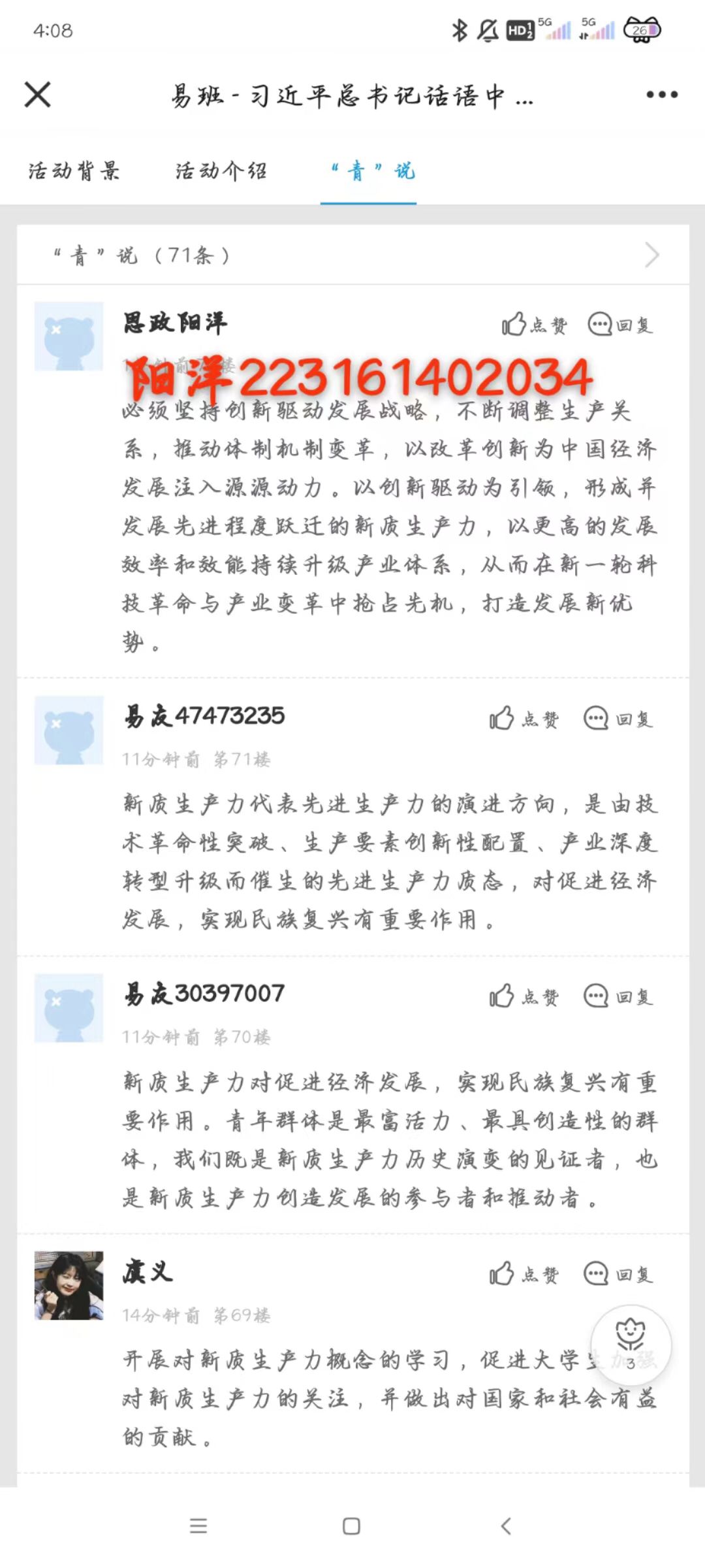 本次活动由学院组织,主要包括“青说”、知识竞答两个板块。在“青说”板块中,同学们系统学习了关于“新质生产力”的相关知识,并展开积极讨论。同学们纷纷表示,新质生产力是创新起主导作用,具有高科技、高效能、高质量的特征,符合新发展理念的先进生产力质态,对于掌握未来发展主动权、推进中国式现代化具有重要意义。在“知识竞答”板块中,同学们坚持在学中思,思中学,通过对五个小问题的思考和解答进一步巩固和拓展了对新质生产力的认识和理解。本次活动形式新颖、内容丰富,引发同学们热烈反响,活动页面浏览量达490人次,拥有独立访客364人,发表评论总计178次。