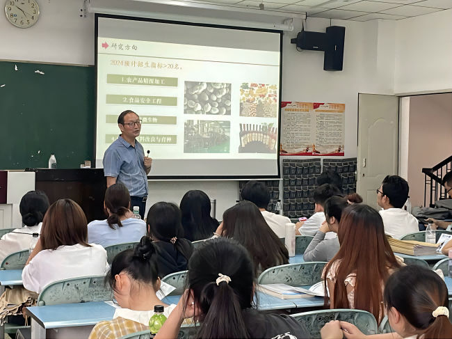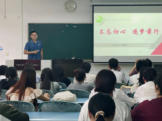 宣讲会上,景晟林博士先以四川师范大学生命科学学院的概况作为切入点,介绍了该学院的基本情况。他详细阐述了学院的师资力量,包括教师人数、学术背景及科研成果等。同时,他也为大家介绍了学院的办学成就,让同学们对该学院的有了更深入的了解;在专业介绍环节,景晟林博士从专业设置、课程设置、培养目标等方面,详细介绍了生命科学学院各专业的特点与优势。随后,苗玉志教授针对食品专业进行了补充介绍。他讲解了食品专业的课程设置、研究方向以及就业前景,他还分享了自己在食品领域的研究成果和经验,激发了同学们对食品科学的兴趣。最后,三位老师与同学们进行了交流互动。他们耐心解答同学们关于考研、专业选择、就业前景等方面的疑问,为同学们提供了宝贵的建议和指导。