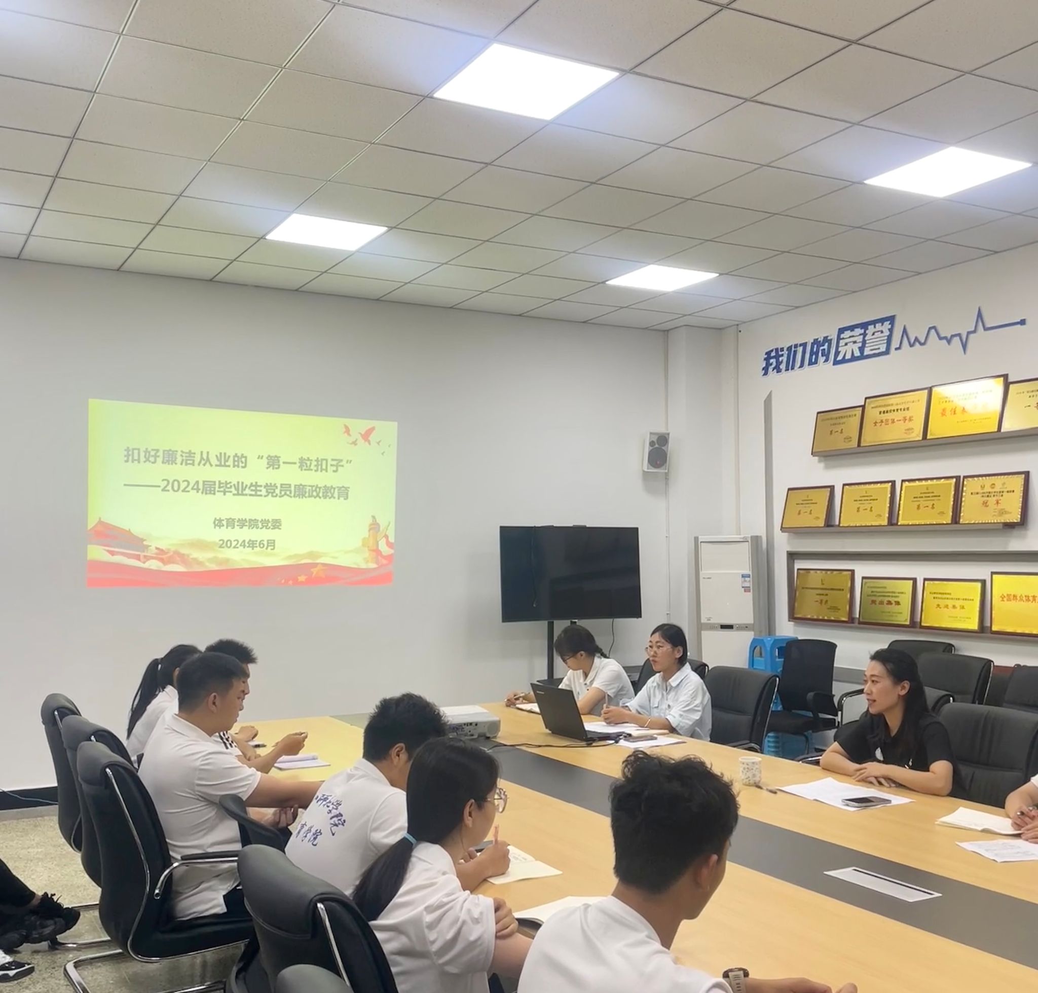 本网讯(文图/蒋顺兵)6月17日下午18点,体育学院党委副书记在会议室为毕业生党员讲题为扣好廉洁从业的“第一粒扣子”——2024届毕业生党员党纪教育(廉洁教育)主题党课。