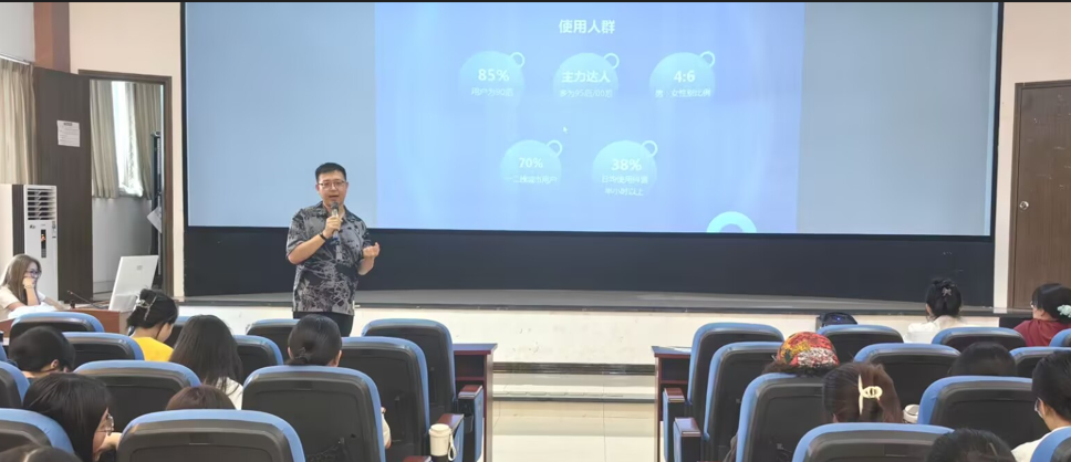韩雪飞从抖音简介、方向定位、视频制作和运营技巧四个方面入手,为同学们详细讲解了抖音、微视频制作技巧。他列举了大量的调研数据,结合自己的实践经验,带来了一场生动有趣的培训课程。他指出,受众是进行抖音、微视频制作的方向和目标,在制作微视频和运营抖音时要明确受众群体,有针对性地制作视频。