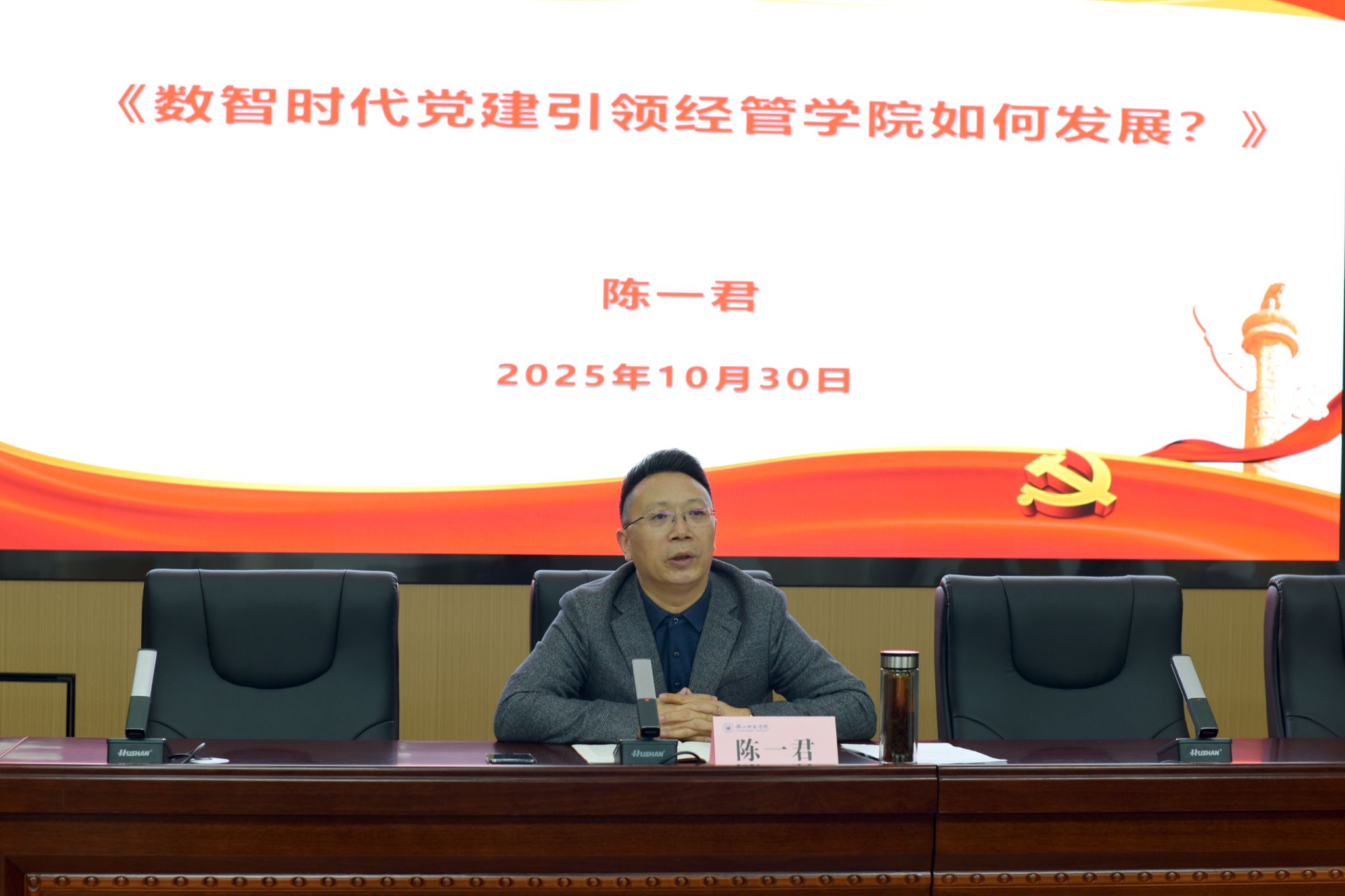 本网讯(文图/李可)10月30日,学校在弘毅楼第三会议室开展了以“数智时代党建引领经管学院如何发展”为主题的专题党课,本次党课由校党委副书记陈一君主讲,经管学院全体党员教师及学生入党积极分子到场聆听,共同探讨在数字化、智能化浪潮下,如何通过加强党的建设引领学院实现内涵式发展和战略性突破。