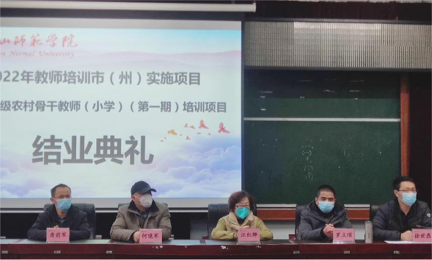 本网讯(文/冯紫君 图/郑学礼、缑月娇、蒲绍东)12月13日,2022年“国培项目”市(州)实施项目——县级农村骨干小学教师培训(第一期)结业典礼在弘毅楼413教室顺利举行。乐山师范学院教育科学学院国培首席专家、院长汪红烨、党委书记罗立顺、党委副书记兼纪委书记何晓军、副院长徐世鼎、唐前军以及此次培训的50名学员参加了结业典礼。结业典礼由徐世鼎主持。