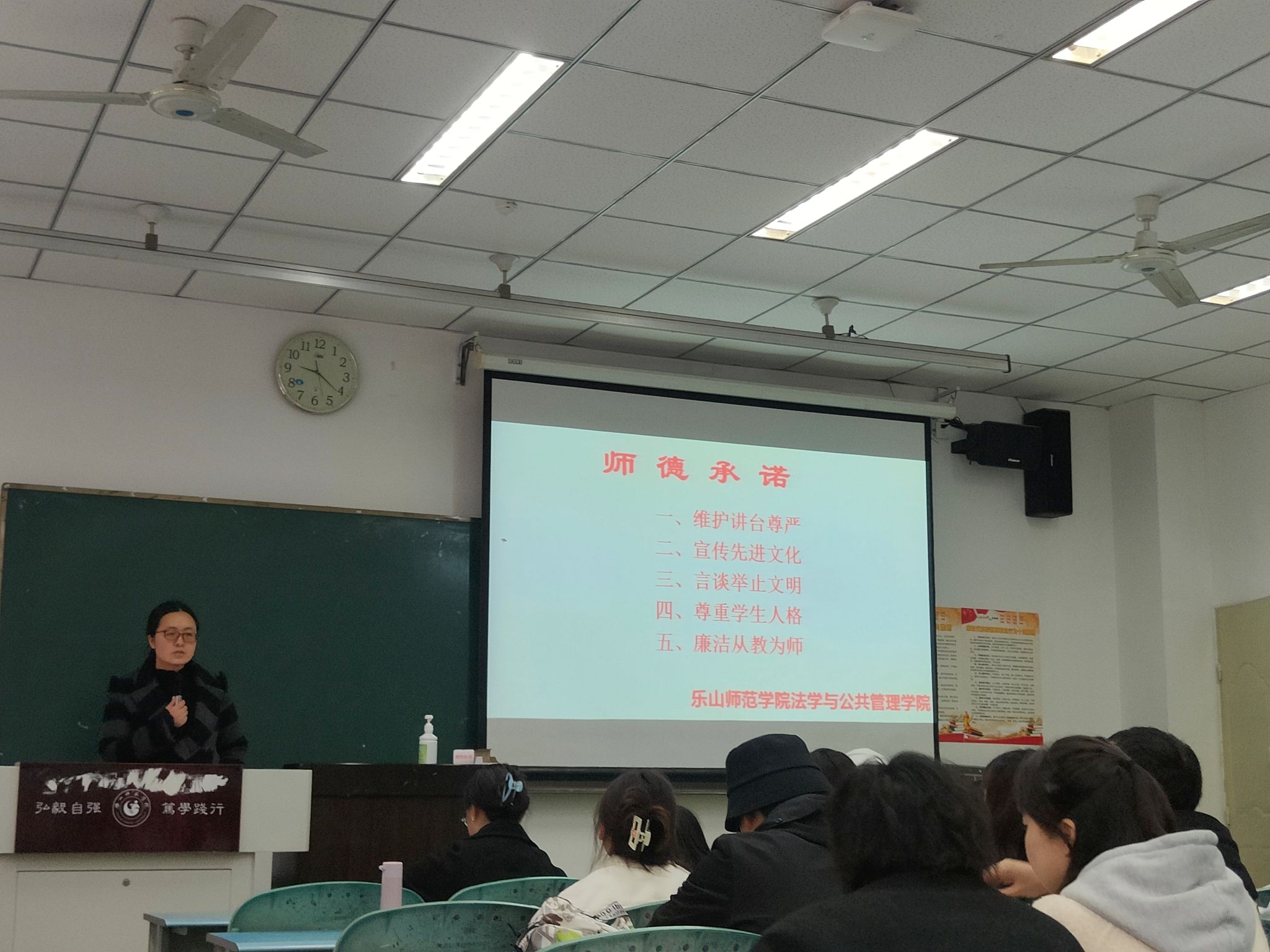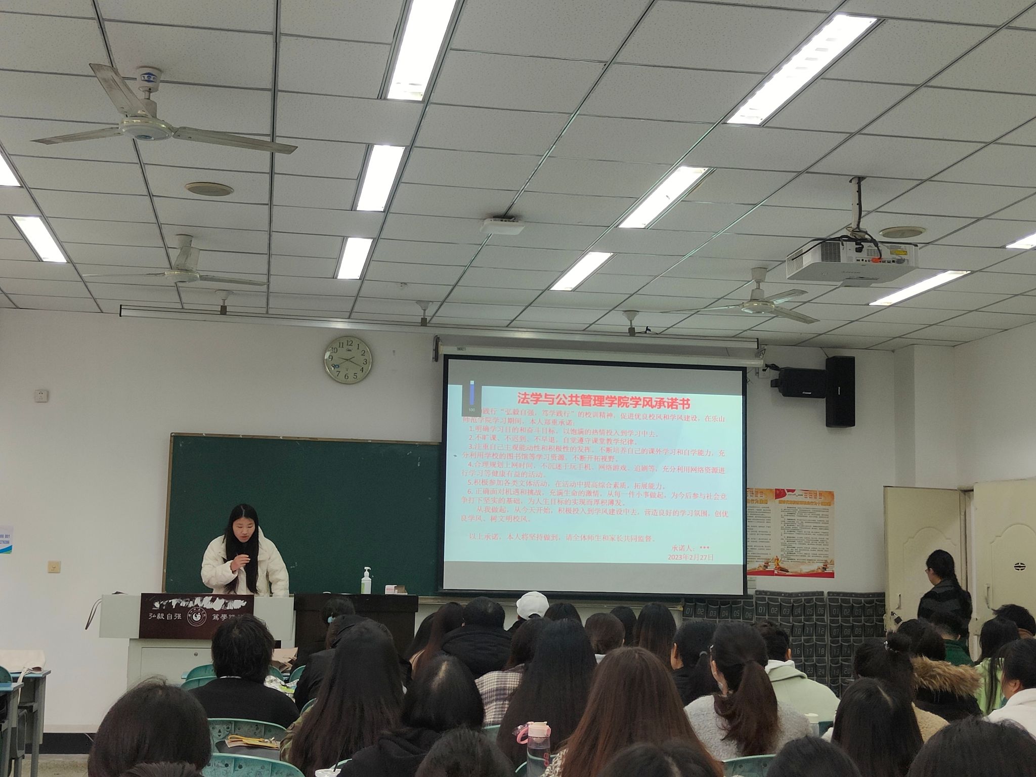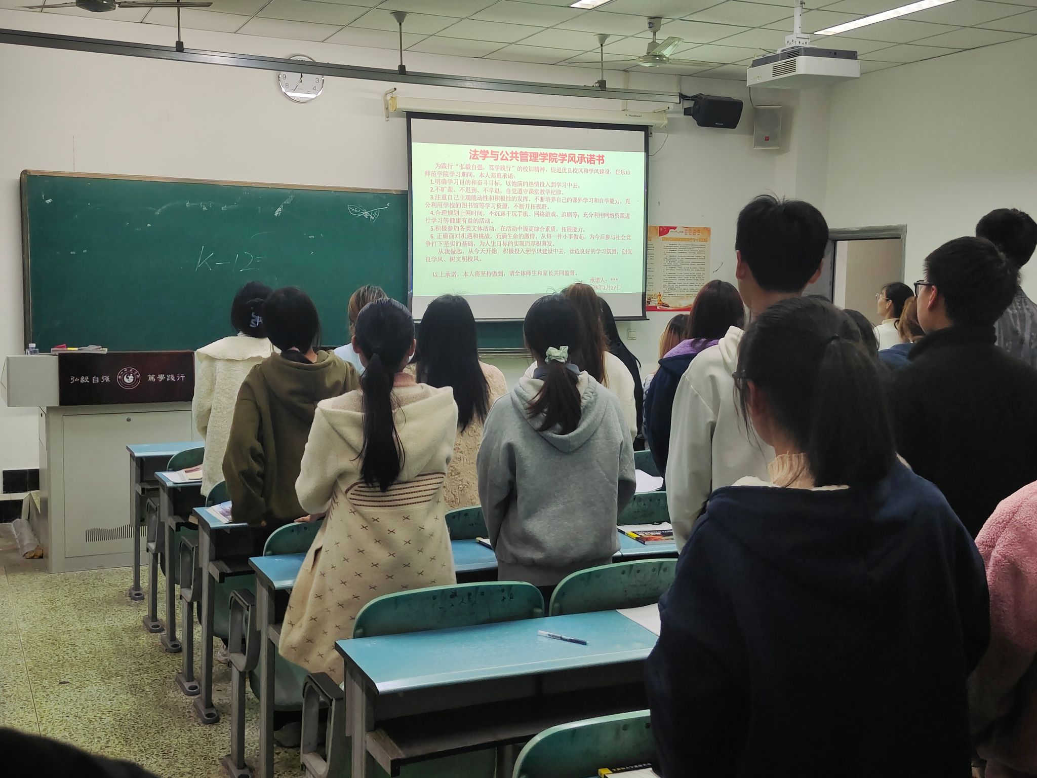 本网讯(文/杨兵 图/朱思宇)为加强师德师风建设,营造优良学风,法学与公共管理学院各班级师生于2月27日在开学第一课开展了学风师德承诺活动。