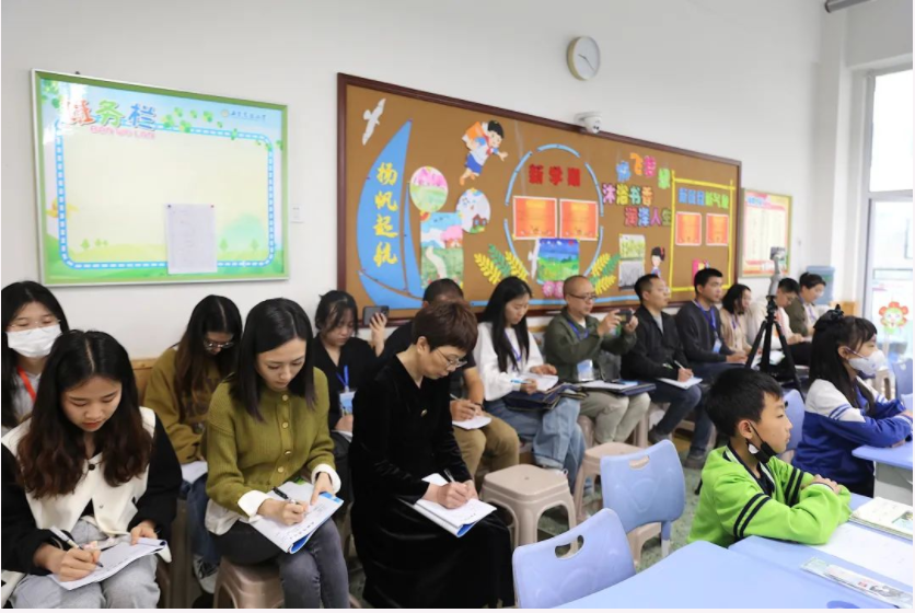 听一节随堂。学员们进入教学楼,观摩各校学科老师的课堂。四节课堂气氛活跃,学生与观课学员们都沉浸于精巧的教学环节设计,引发了热烈的讨论。