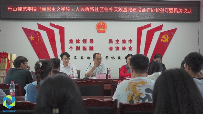 本网讯(文图/黄淇玮)6月2日上午,乐山师范学院马克思主义学院、人民西路社区校外实践基地建设合作协议签订暨揭牌仪式在市中区海棠街道人民西路社区隆重举行。马克思主义学院副院长蒋政、人民西路社区党委书记王利分别代表双方在合作协议上签字,标志着双方在志愿服务、理论宣讲、技能培训等方面开展全面合作。海棠街道党工委委员杨皓媛,出席仪式并讲话。社区相关工作人员,学生代表参加仪式。仪式由人民西路社区党委书记王利主持。