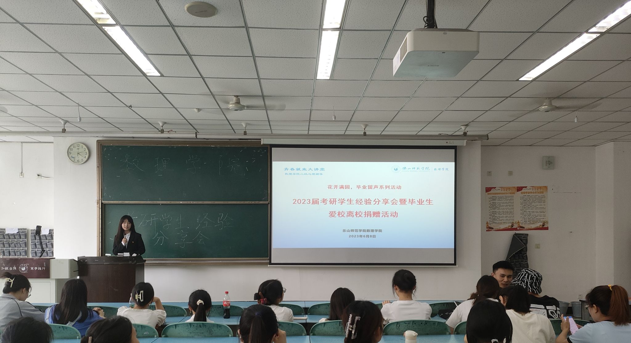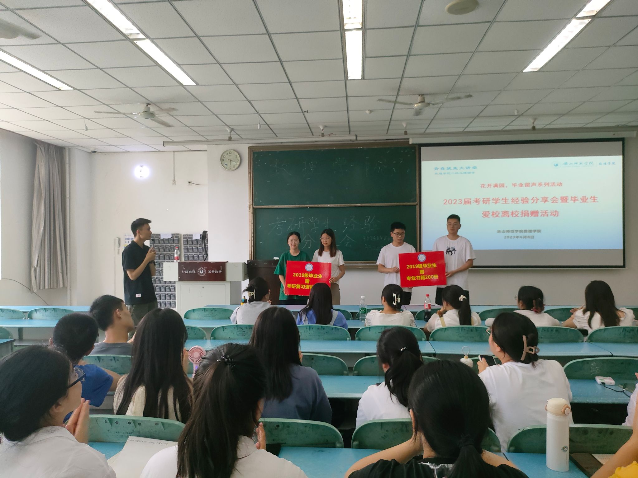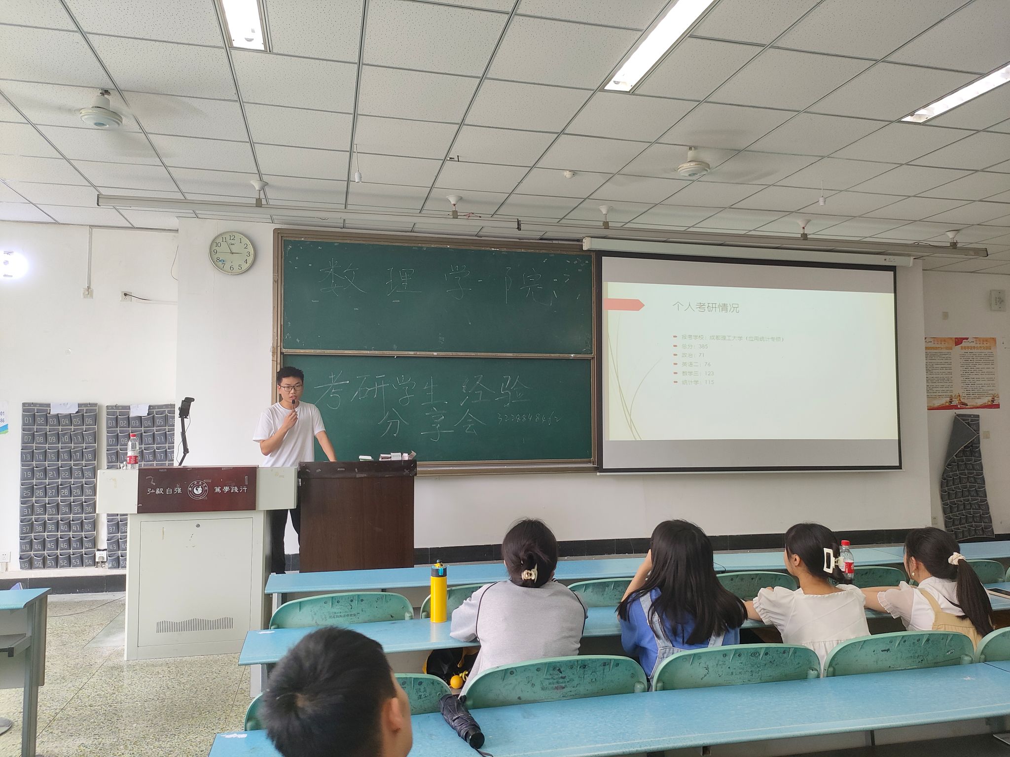 本网讯(文/张珍 图/唐晓琪)6月8日下午,数理学院在行知楼125教室举行考研经验分享会暨毕业生爱心捐赠活动。此次会议由2019级数应专业张青清同学及2019级金融数学专业李芸和同学主讲,数理学院20级、21级有考研意向的学生参加。分享会由20级辅导员廖宇老师主持。