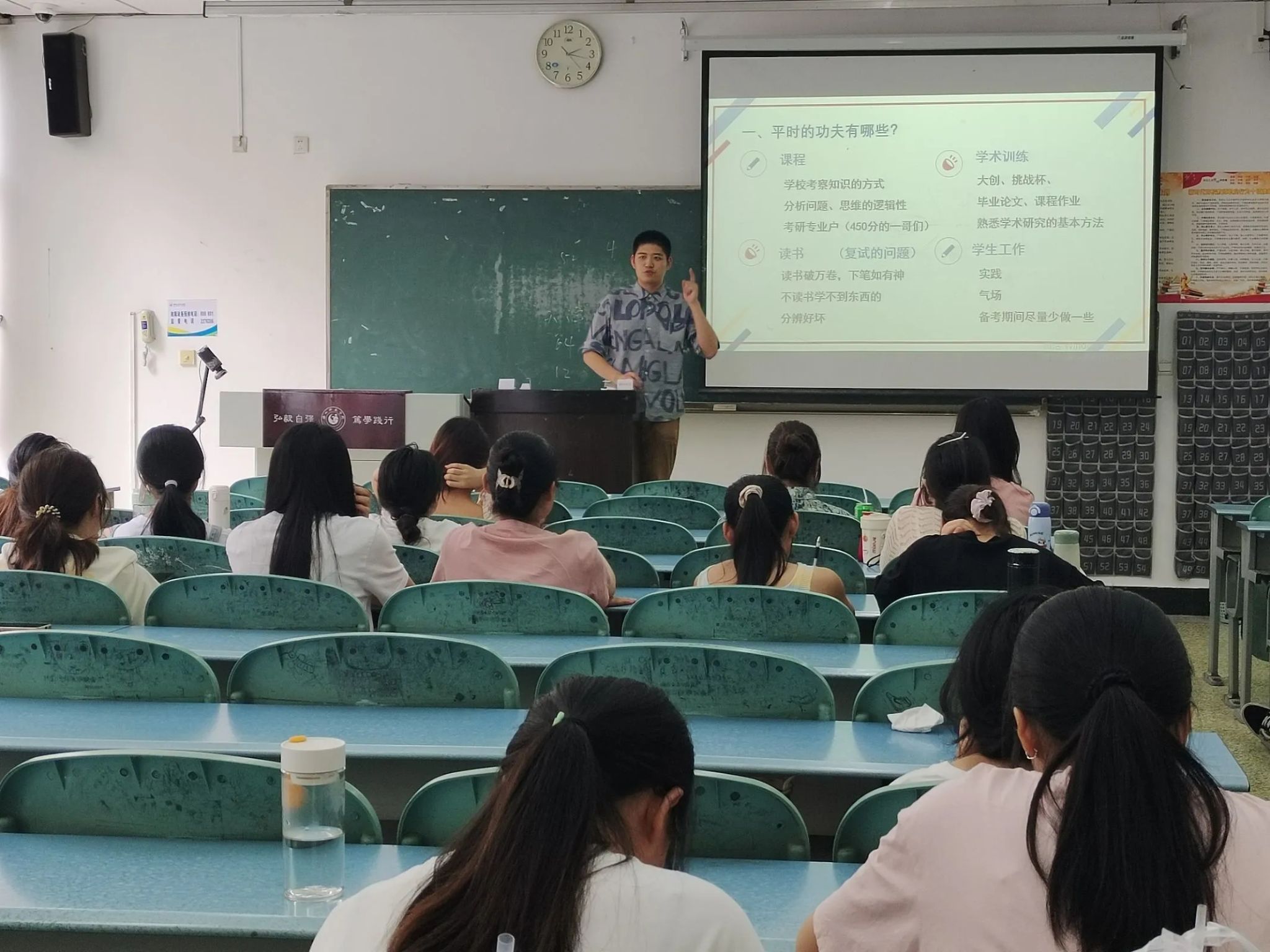 本网讯(文/杨兵 图/郑佳俊)为鼓励和动员2020级、2021级学生考研,给与更多的同学考研指导和帮助,学院邀请19级考研上岸的潘瑞、苏林凤、李欢欢、吴绍海、翟羽佳等同学在行知楼108、109、112教室分别为行政管理、法学、社会工作专业的学生分享自己的备考方法与考研经验,20级、21级有意向考研的学生积极参与。