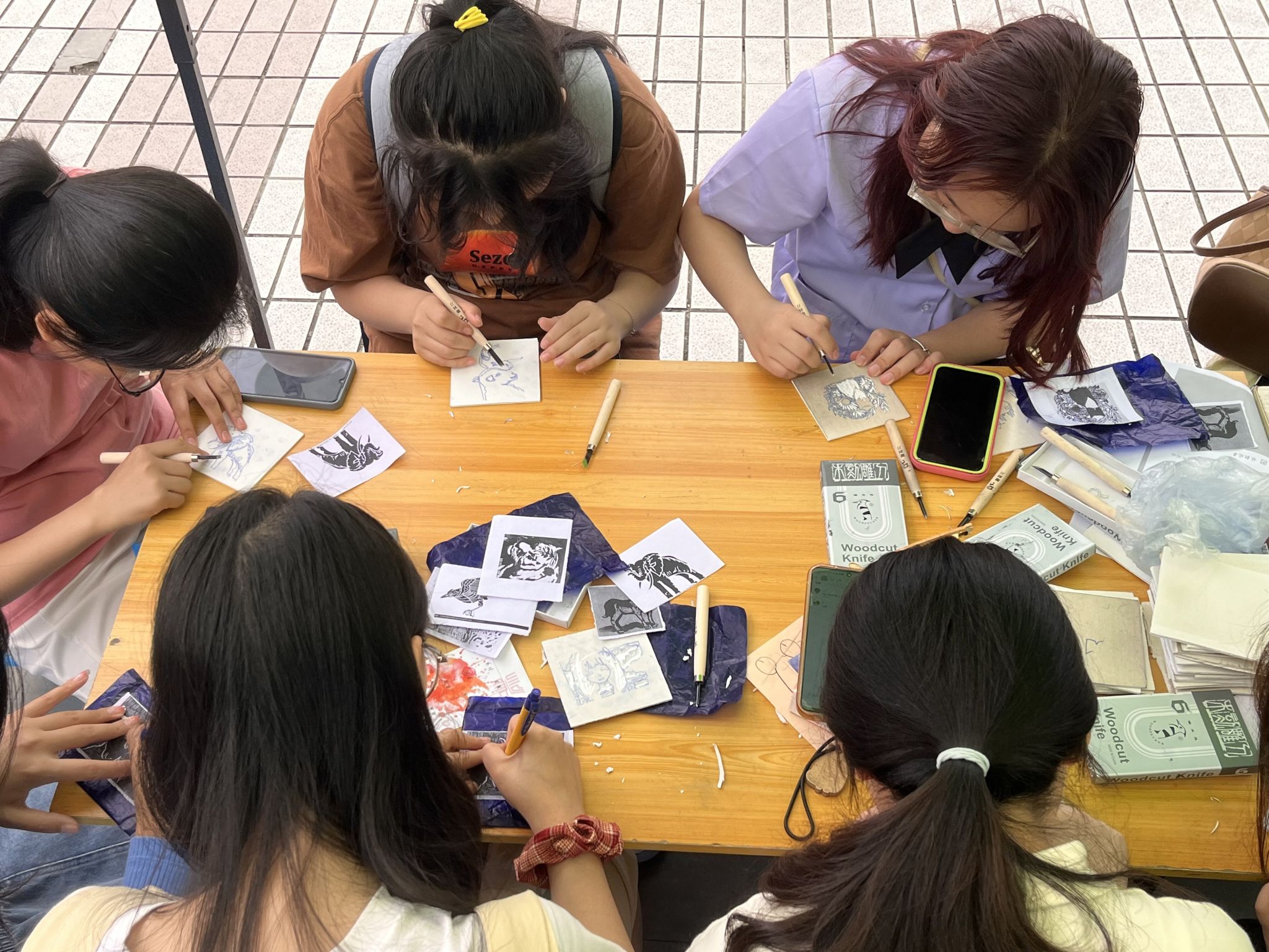 此次艺术周活动持续一天时间,面对全校学生开展美育类体验活动,为大家设置了趣味速写、版画、手工制作、摄影、剪纸、书法、扎染、绘画、爱心义卖等一系列参与度广、操作难度低的活动,着力打造学生积极心理品质。同学们可领取积分卡,在参与各个艺术活动之后积累到独特的印章,完成所有活动即可进行抽奖,奖品精美丰富、活动有声有色,大大增加了同学们对于参与艺术活动的兴趣。
