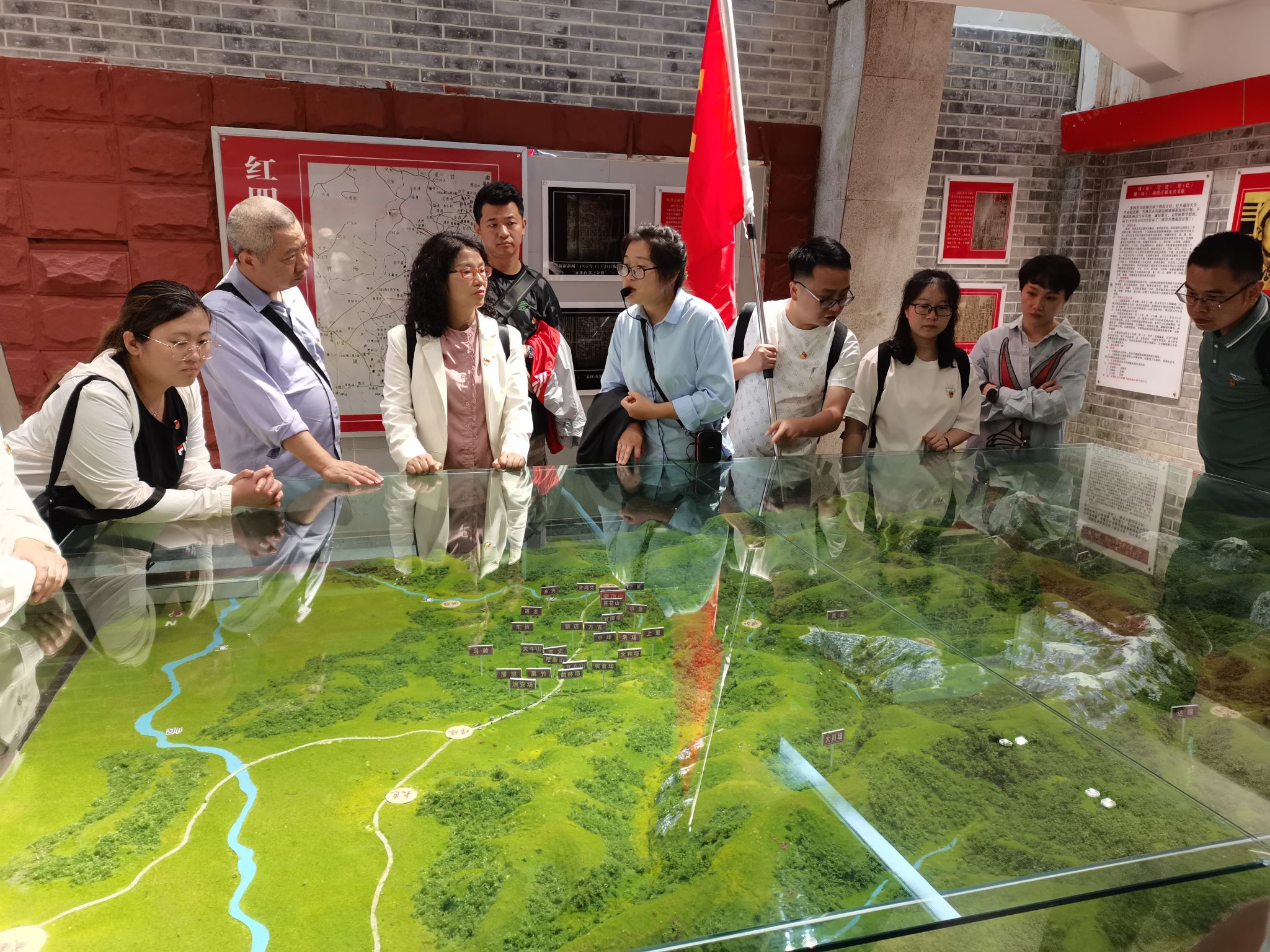 跟随讲解员的步伐,大家从蒙顶山下重走长征路,经过1个多小时的跋涉来到红军百丈关战役纪念馆。为纪念百丈关战役而修建的红军百丈关战役纪念馆,也称蒙山红军纪念馆,坐落于蒙顶山之巅,是红军百丈关战役的指挥部。红军百丈关战役历时18个昼夜,是红军长征史上仅次于湘江血战的一场惨烈战役,也是一场扭转红四方面军战略路线的战役。大家一边聆听讲解员的解说,一边参观馆内红军长征时期留下的文物。一件件烈士遗物、一幅幅珍贵历史照片,让大家深情体会到革命战争的艰难残酷,胜利果实的来之不易。