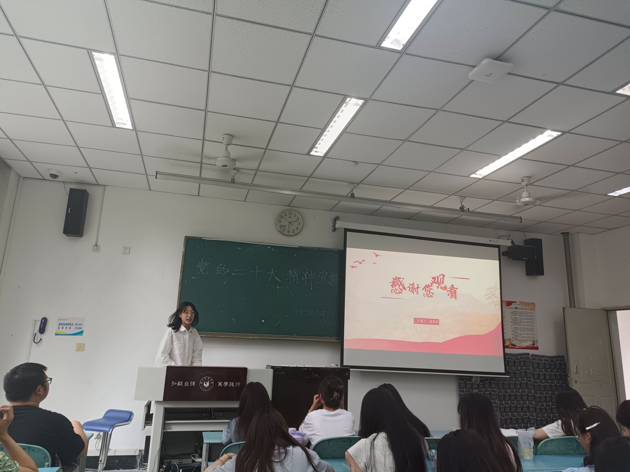 本网讯(文/何叶、图/李国清)为加强习近平新时代中国特色社会主义思想的学习,6月11日18时,马克思主义学院学生宣讲团来到法学与公共管理学院,在行知楼110教室举行了关于“党的二十大精神”的主题宣讲活动。此次宣讲活动,入党积极分子们和党员同志们认真听取习近平新时代中国特色社会主义思想,打牢思想理论基础。