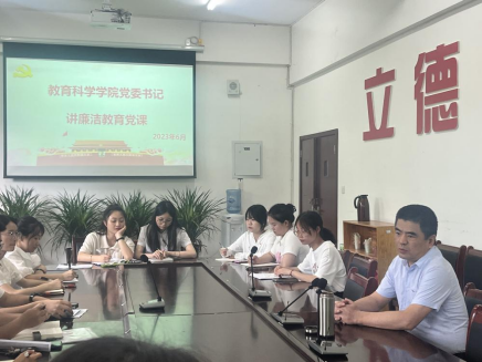 本网讯(文/何羽洁 图/朱俊妍)为进一步加强毕业生党员廉洁意识,筑牢反腐倡廉的思想底线,教育科学学院于6月9日下午在特教大楼B幢101会议室组织了毕业生党员廉洁教育专题党课,学院党委书记罗立顺为党员们授课。