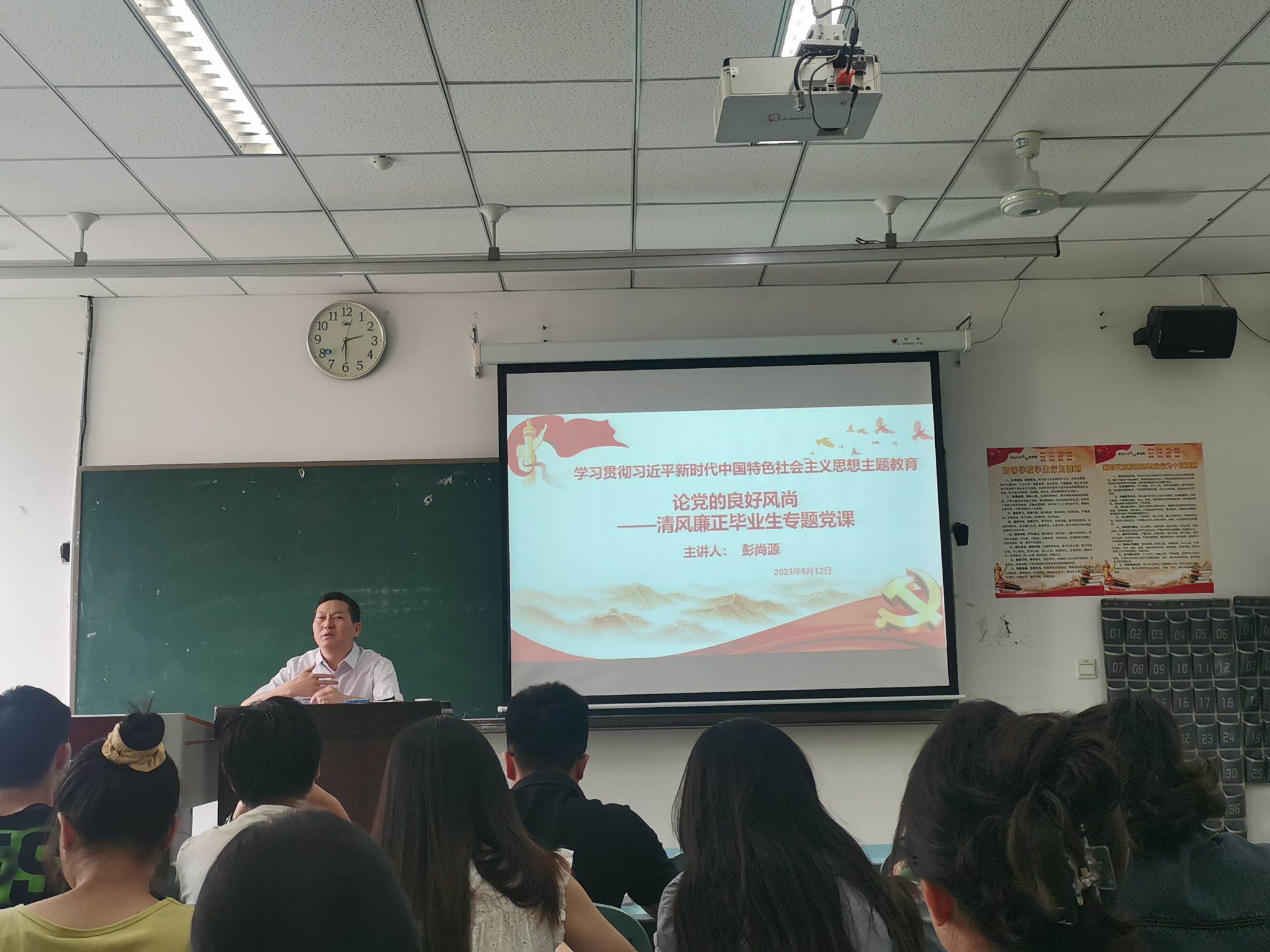 彭尚源在党课中为同学深入地讲解了为什么要开展学习贯彻习近平新时代中国特色社会主义思想主题教育,希望学生党员能深入学习、理解党的主题教育内涵。同时,彭尚源对毕业生党员开展了就业、择业教育,希望党员同学坚持实事求是,认清自我和把握好形势找到适合自己的职业道路,并要求同学们在岗位上知敬畏、守底线,做到崇廉、尚廉。