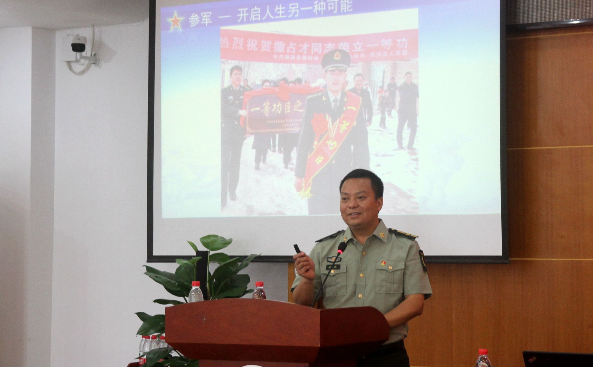 梁光德以从农民工到一等功臣的撒占才,从炊事员到一等功臣、火箭军一级军士长的何贤达两位英雄事迹引入,介绍了他们从参军入伍到在军营建功立业的故事,激励学业有成的同学们,在就业择业的关键期,不负时代使命,不负青春梦想,肩负起建设祖国、保卫祖国的使命,投身绿色军营,淬炼无悔青春。他还为同学们详细介绍了直招军士的优抚政策,报名时间、政审等具体操作流程。