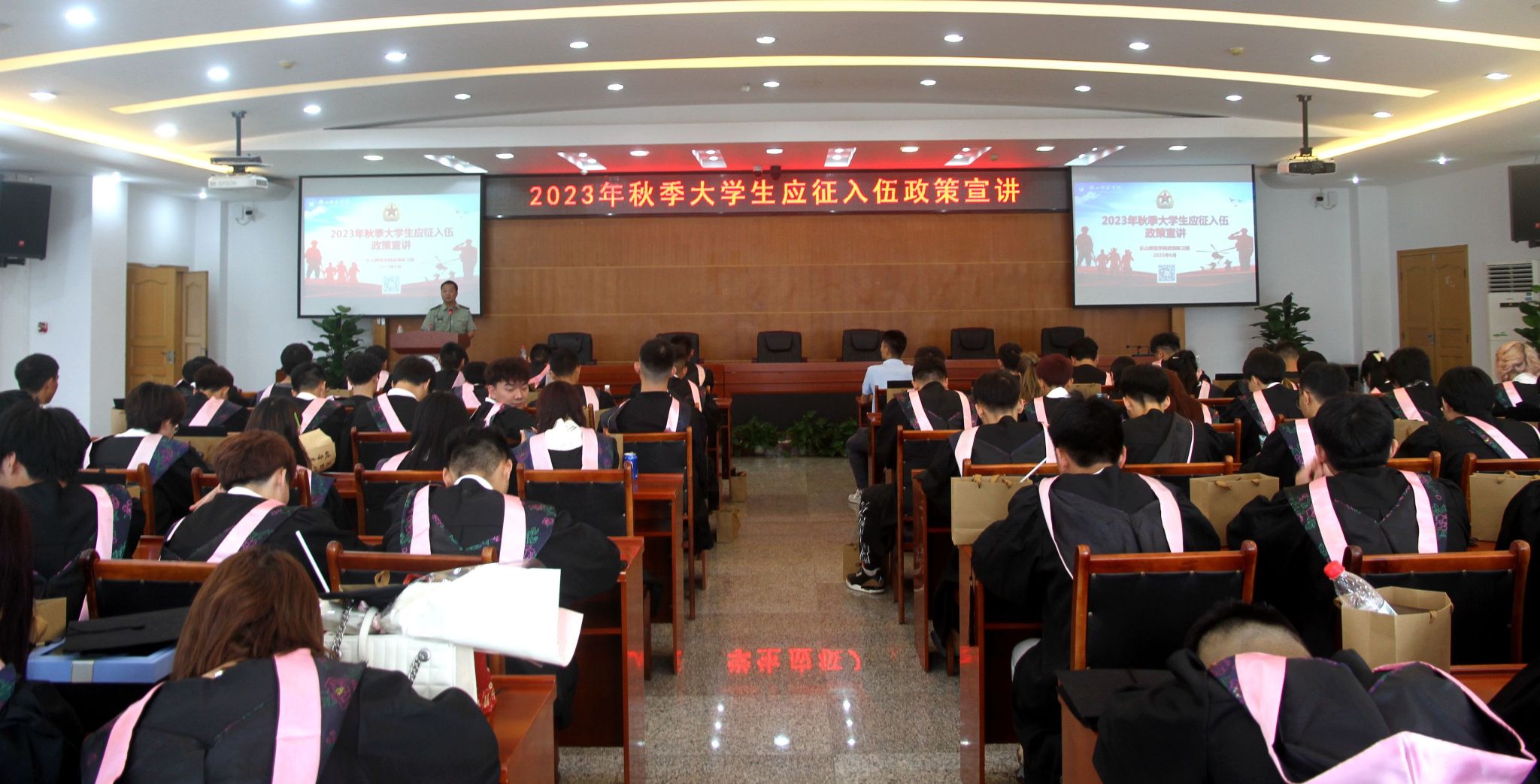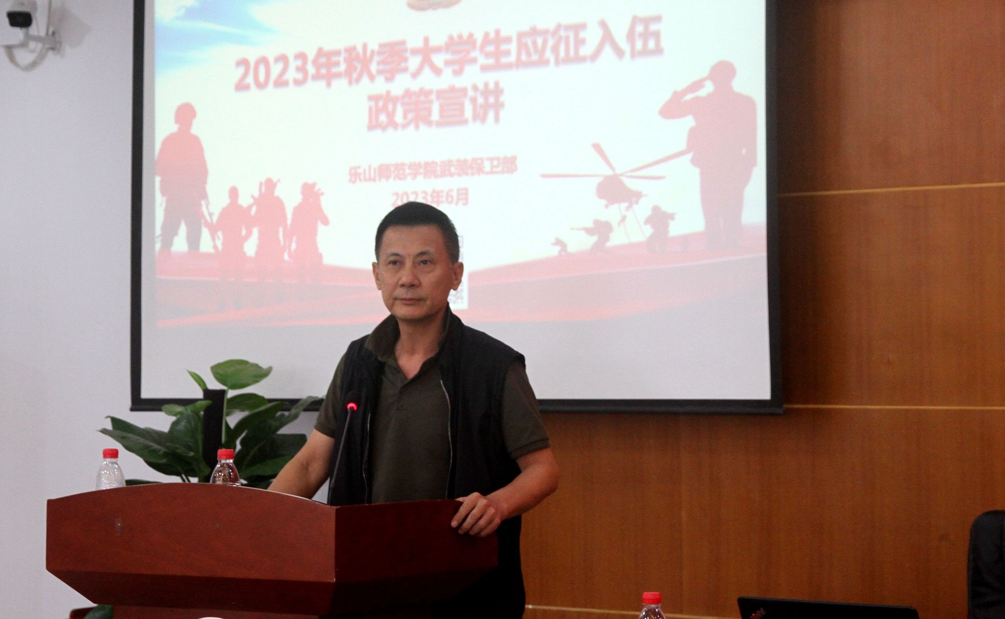 本网讯(文图/薛小丽)6月13日,在毕业季我校举行2023届毕业典礼暨授位仪式的当日,武装保卫部在图书馆学术报告厅为体育学院全体毕业生举办了一场特别的爱国主义教育暨应征入伍政策专场宣讲会。武装保卫部副部长梁光德、征兵工作站干事徐凌云等参加宣讲。