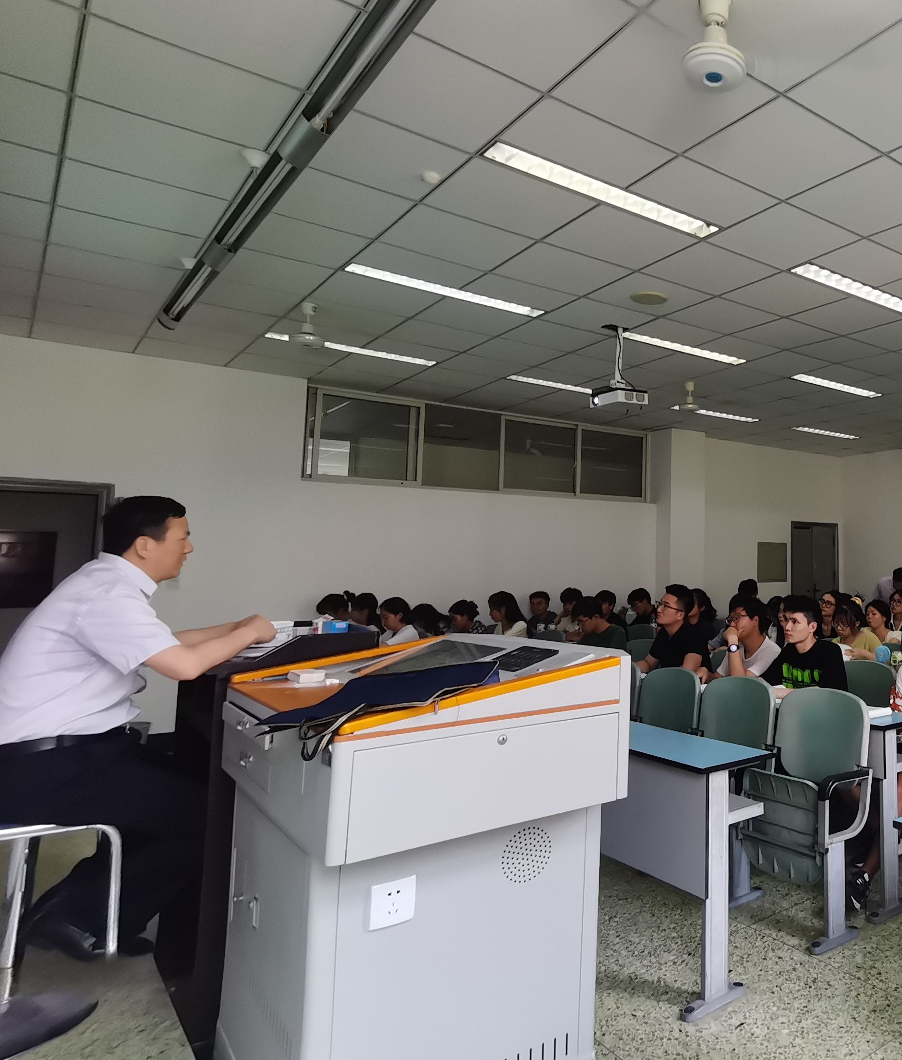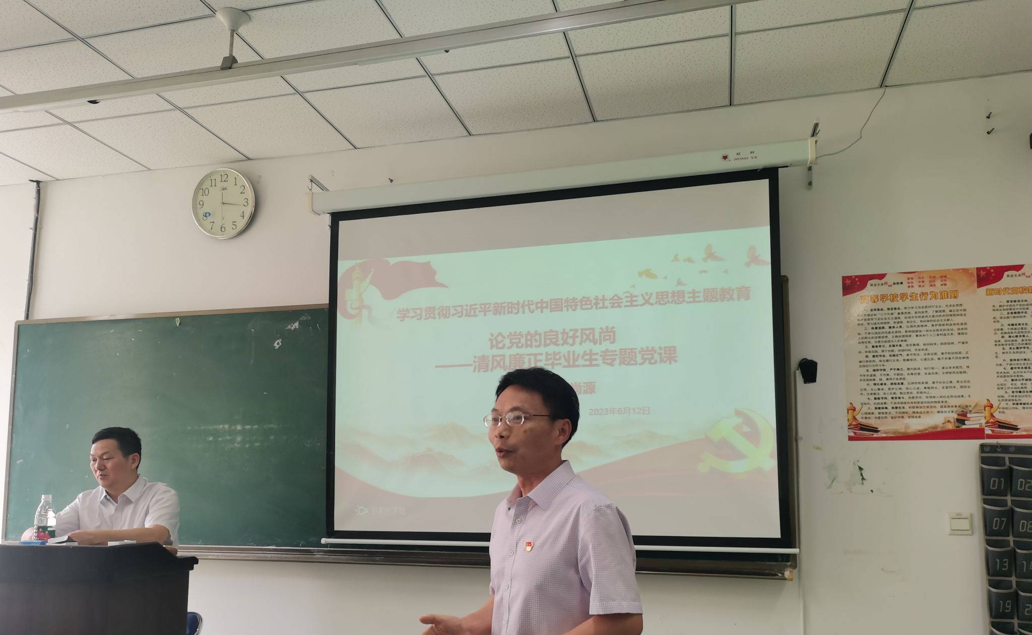 彭尚源在党课中为同学深入地讲解了为什么要开展学习贯彻习近平新时代中国特色社会主义思想主题教育,希望学生党员能深入学习、理解党的主题教育内涵。同时,彭尚源对毕业生党员开展了就业、择业教育,希望党员同学坚持实事求是,认清自我和把握好形势找到适合自己的职业道路,并要求同学们在岗位上知敬畏、守底线,做到崇廉、尚廉。最后,彭尚源祝贺各位毕业生党员顺利毕业,祝福毕业生党员前程锦绣!