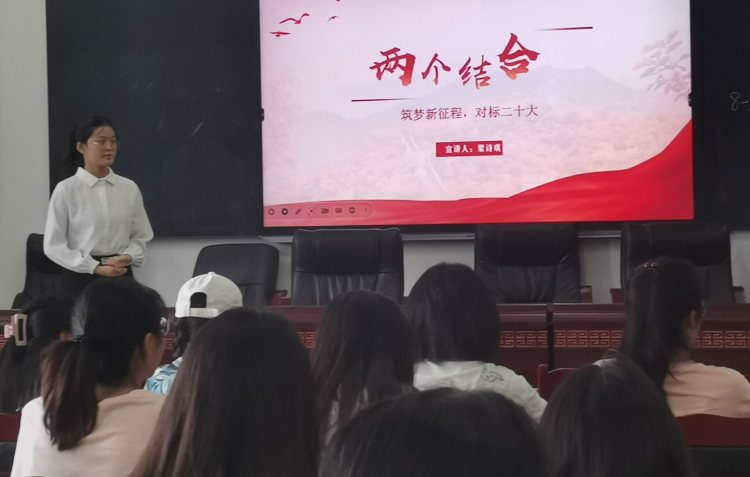 本次宣讲的主题是“两个结合”。梁诗琪指出,坚持和发展马克思主义必须同中国具体实践相结合,是我们党在新民主主义革命、社会主义革命和建设、改革开放以及推动中国特色社会主义进入新时代的伟大实践中得出的基本结论,是我们必须长期坚持的马克思主义科学的世界观和方法论,历史和实践均表明,只有马克思主义同中国具体实践相结合,在马克思主义基本原理的指导下走中国自己的路,我们党的事业才能继续从胜利走向胜利,从辉煌走向辉煌。梁诗琪指出,马克思主义传入中国并最终扎根中国大地决不是偶然的,而是同我国传承了几千年的优秀历史文化和广大人民的价值观念融通的,这两者在价值观层面的高度契合性,为马克思主义基本原理同中华优秀传统文化相结合提供了前提条件。习近平总书记强调:“中华优秀传统文化是我们党创新理论的‘根’”“我们现在就是要理直气壮、很自豪地去做这件事,去挖掘、去结合中华优秀传统文化,真正实现马克思主义中国化时代化”。梁诗琪指出,“两个结合"既是对百年党史经验、成就、贡献的总结,也是习近平新时代中国特色社会主义思想在十八大以来伟大社会实践中产生的新经验、新成就、新贡献,还是中华民族伟大复兴新征程的伟大使命、科学路径、文明前景,“两个结合”作为新时代马克思主义中国化的重要特征和根本的方法论,具有重要的战略意义。对于如何做到“两个结合”,她认为,坚持“实事求是”这个活的灵魂,坚持实践是检验真理的唯一标准,坚持传承和弘扬中国优秀传统文化、优秀革命文化,坚持培育和践行社会主义核心价值观等则是关键。最后,宣讲团倡议,作为新时代的青年大学生党员,我们一定要带头学习领会“两个结合”的精髓和要义,并将其运用在我们学习成长、发展成才的大学生活和人生实践中,持续用力,在奋进社会主义现代化新征程的路上拼搏奋进、久久为功,决不辜负党和人民的信任和期待。