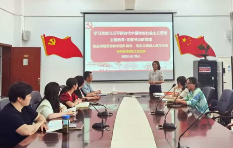 本网讯(文/王欢图/李晓畅)6月16日下午,特教学院党委特殊教育教职工党支部书记李秀讲学习贯彻习近平新时代中国特色社会主义思想主题教育党课在特教大楼A-408会议室举行,党支部全体党员聆听了党课。