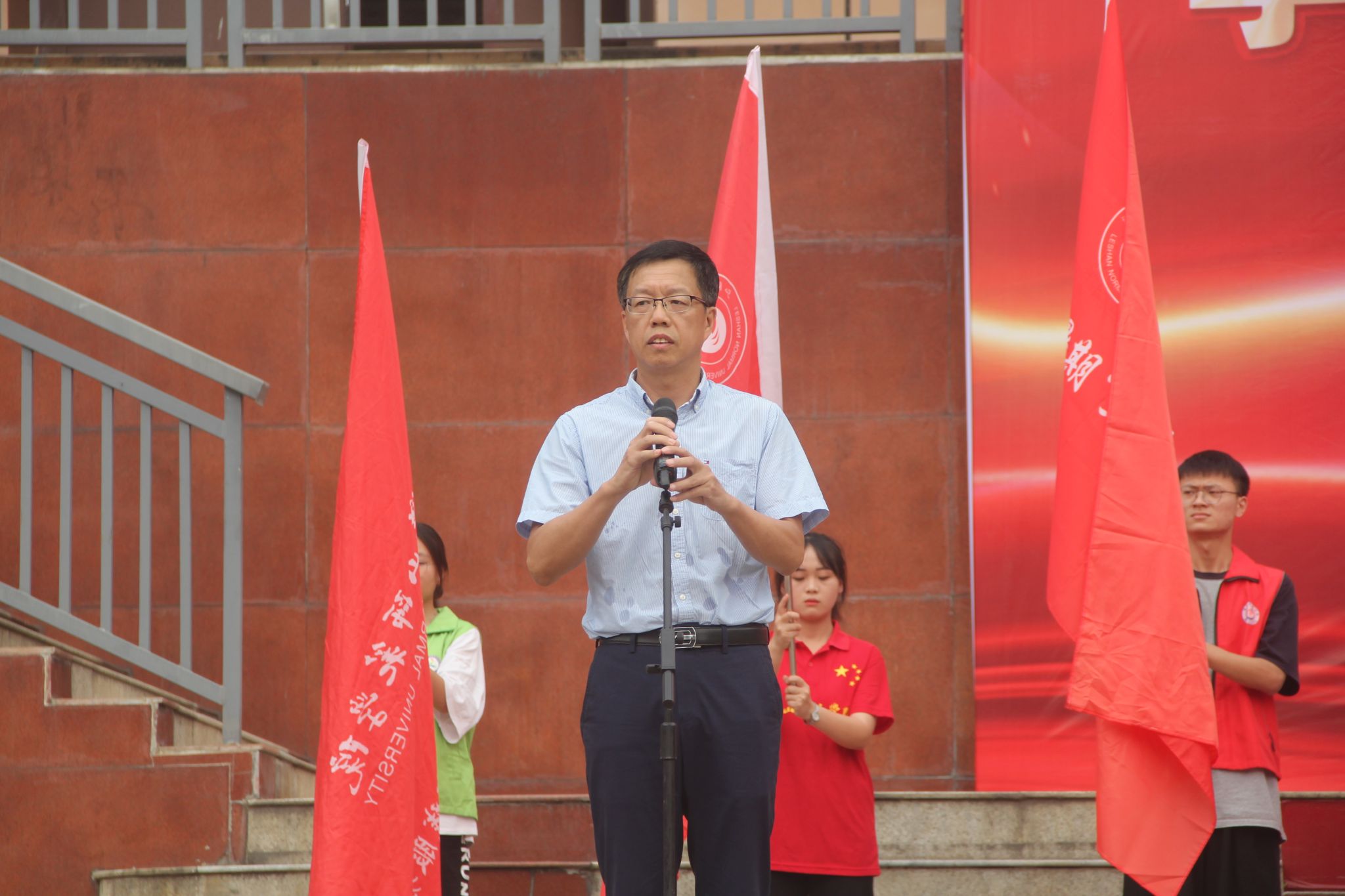 党委学生工作部部长黄显刚发表讲话,并对教学院、社会实践团队及奔赴各地开展社会实践的广大青年学生提出要求与希望,希望各方通力合作,为培养新时代好青年搭建平台、提供指导、给予支持;希望广大青年党员、青年学生充分利用社会实践平台,扎实开展社会实践活动,通过真学真看真听感悟思想伟力,深化人民情感,强化责任担当,让“强国有我、青春有为”在实践中不仅走进人民生活,更要扎根青年心底;希望各实践团队充分利用互联网平台,将乐师青年学生的良好风貌、责任担当展现出来,将优秀事迹、典型做法宣传出来。