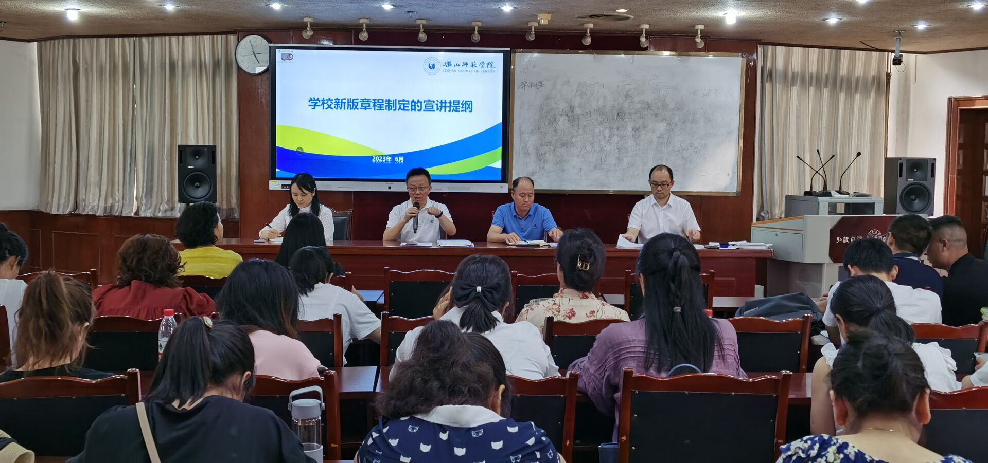 本网讯(文、图/毛敏)6月28日,音乐学院召开教职工大会,组织全体教职工认真学习学校章程和基本制度,会议由党委书记罗谊恒主持。