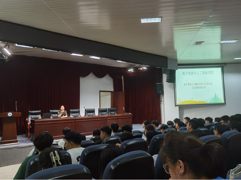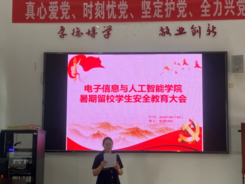 本网讯(文图/陈雪婷)临近暑假,为了增强同学们的暑期留校安全意识,暑假到来之际,电子信息与人工智能学院于6月30日下午分别在特教C501、特教A102召开暑期留校安全教育会议,会议由辅导员谭红梅、狄红霞、雷雄锴、肖苗老师主讲,学院全体留校学生共同参加。