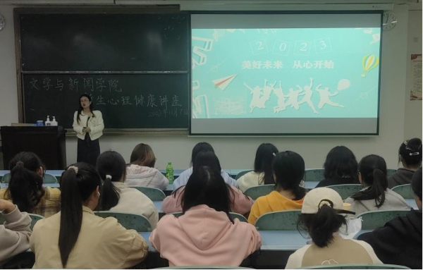 本网讯(文图/赵彬颖)为了增强大一新生的适应能力,掌握自我心理调适的技能,为未来四年的大学生活奠定良好的基础,11月7日晚,文学与新闻学院在行知楼125教室举行新生心理健康讲座。本次心理健康讲座邀请到廖文莉老师担任主讲,文新学院新生辅导员蔡光军和文新学院2023级全体新生参与了本次学习活动。