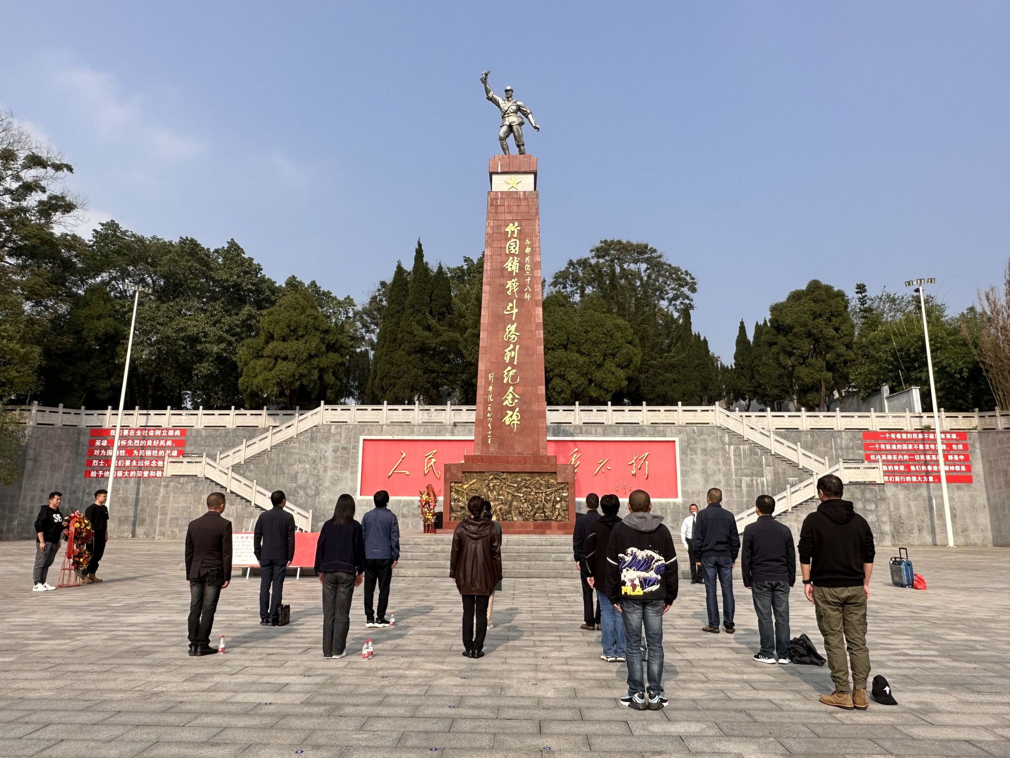 在宏伟庄严的竹园铺战斗胜利纪念碑前,全体肃立,齐唱《中华人民共和国国歌》,重温入党誓词。