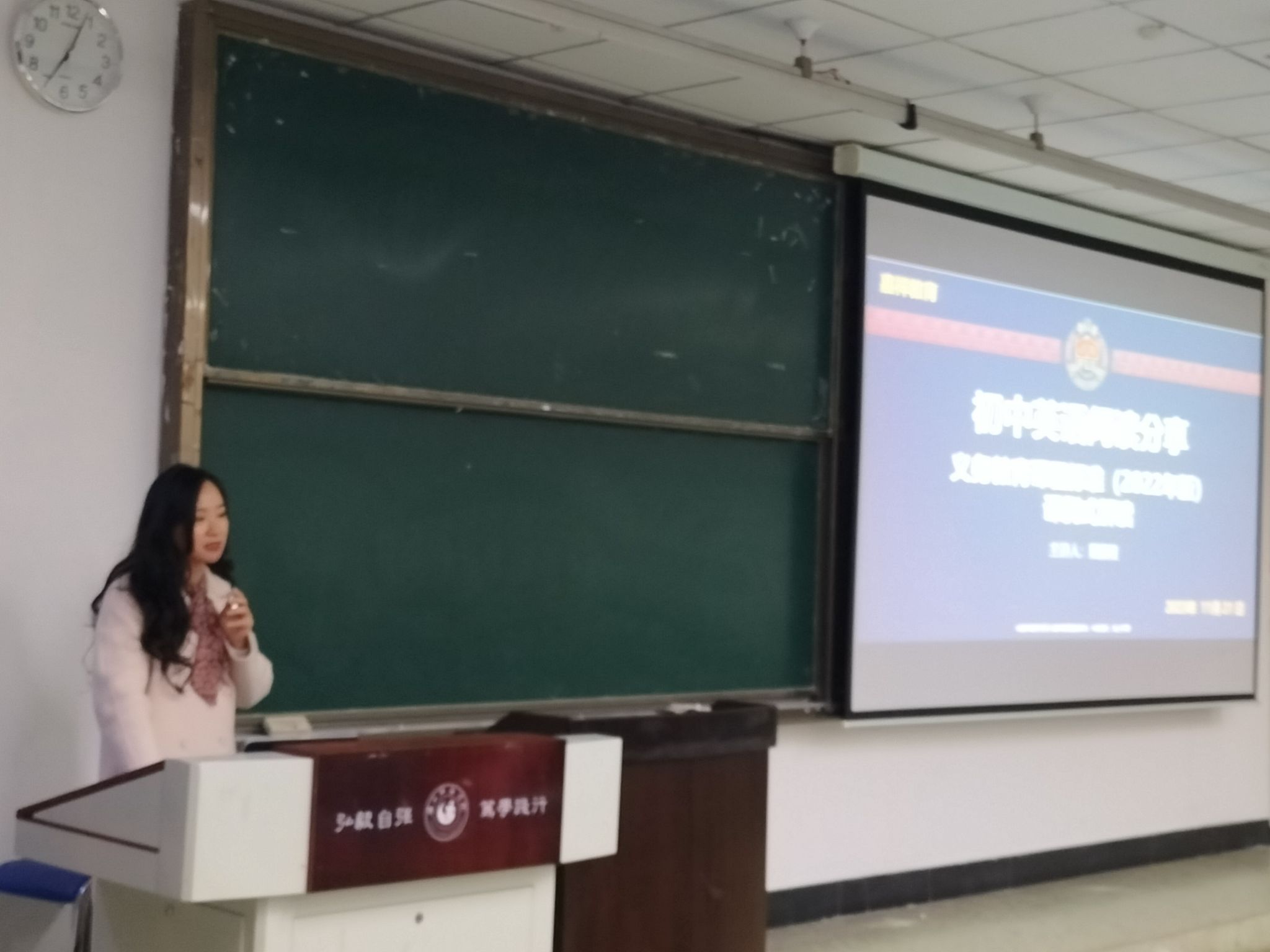 本网讯(文图/苏相君)2023年11月21日晚,乐山嘉祥外国语学校粟潇筱老师受邀在行知楼125教室为2023级英语专业全年级同学作了题为“初中英语课程的育人功能”的专题报告。